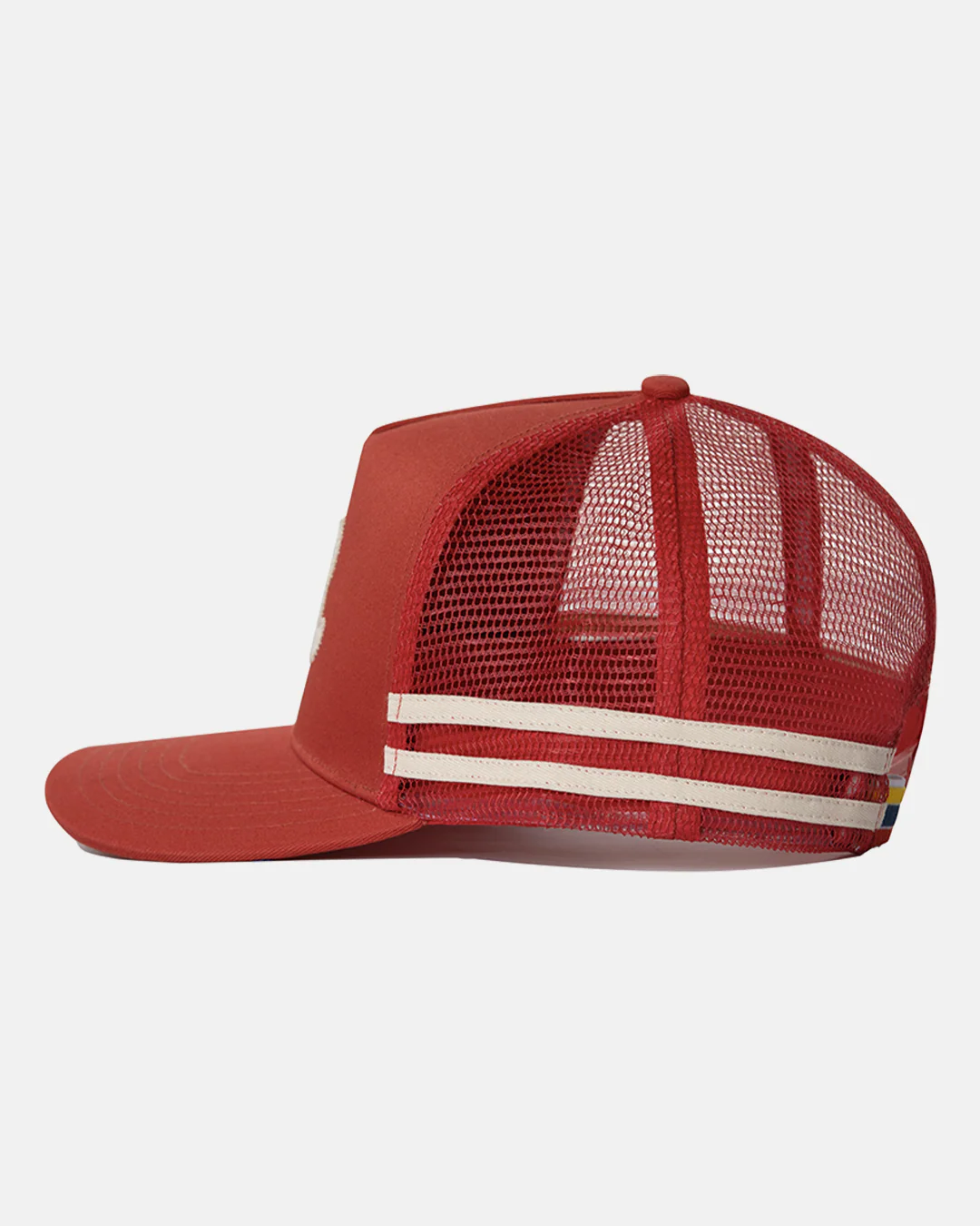 A canvas build to withstand years on the road, red with racing stripes so the miles fly by a little faster. Mesh back to let the heat out and the breeze in.