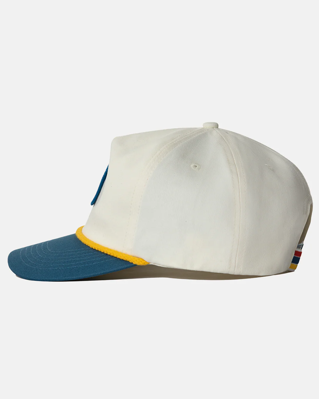 Five panels, two tones, and a Mañana badge logo. For the chromatically indecisive, because deciding what color hat to wear becomes half as hard when you double the number of colors. Yellow braided cord, Blue brim.